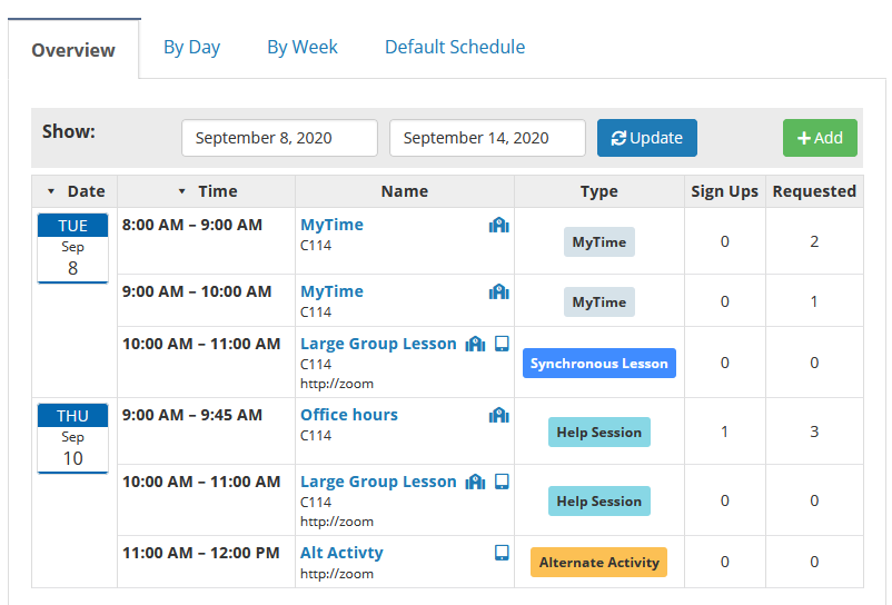 Teachers can set up their availabilty by day, by week, or as a default schedule. They can limit the number of students that can sign up for a session, as well as provide other details, such as location, online location, and other details