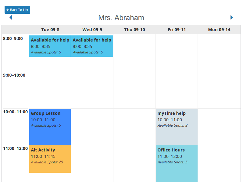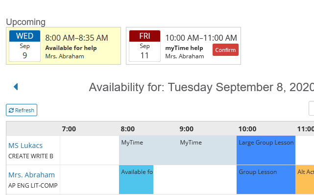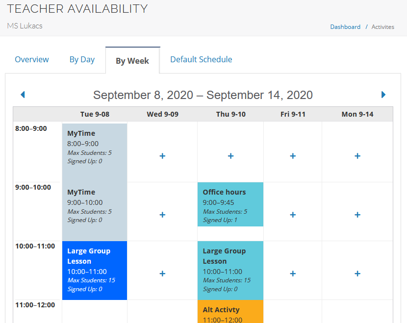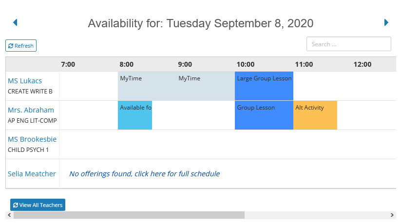 Teacher Availability is a flexible system that allows for various implementations for both online learning and hybrid systems. It allows for scheduling small group lessons, more direct larger group lesson, seminars, discussions, group activities, study sessions or other supports throughout the week.